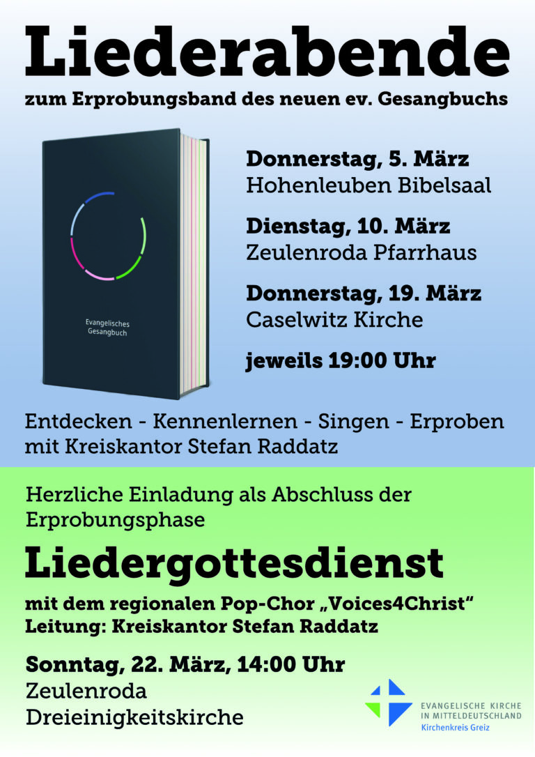 Geplant ist außerdem bereits ein Liedergottesdienst zum Erprobungsband am 22. März 2026, um 14 Uhr in der Dreieinigkeitskirche Zeulenroda mit dem regionalen Pop-Chor „Voices4Christ“.
