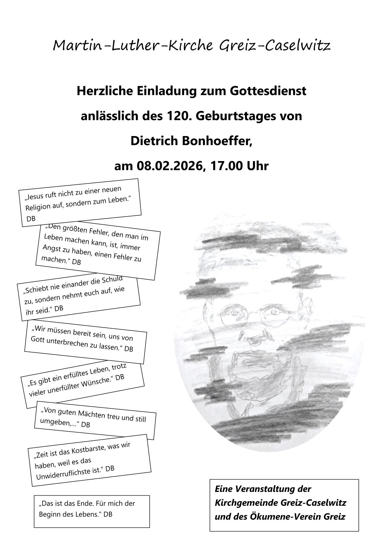 Am 8. Februar 2026 um 17.00 Uhr findet in der Kirche zu Greiz-Caselwitz ein ökumenischer Gedenkgottesdienst zu Ehren des 120. Geburtstages von Dietrich Bonhoeffer statt. Seine Gedanken, seine Worte, seine Glaubensstärke, aber auch seine Sicht auf die dunklen Zeiten der deutschen Geschichte des 20. Jahrhunderts, verbunden mit seiner Art des Widerstands, machten und machen ihn für viele Menschen zu einem Vorbild. Manch einer spricht sogar von einem „modernen Heiligen“. Er stand mit großem Mut zu seinen Überzeugungen. Olaf Scholz schreibt über Bonhoeffer: „In einer Zeit, in der gesellschaftliche Spaltungen zunehmen, kommt es auf den Beitrag jedes und jeder Einzelnen für Freiheit und Verständigung an. Denn der Schutz der Menschenwürde ist die Aufforderung zu ständiger Wachsamkeit und aktiver Menschlichkeit – jeden Tag“. Bonhoeffer schreibt in seinen Texten: „Ich glaube, dass Gott aus allem, auch aus dem Bösesten, Gutes entstehen lassen kann und will. Dafür braucht er Menschen, die sich alle Dinge zum Besten dienen lassen. Ich glaube, dass Gott uns in jeder Notlage so viel Widerstandskraft geben will, wie wir brauchen. Aber er gibt sie nicht im voraus, damit wir uns nicht auf uns selbst, sondern allein auf ihn verlassen.“