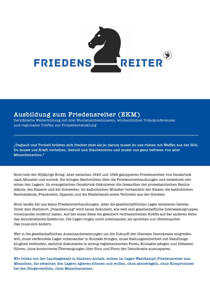 Wir bilden vor der Landtagswahl in Sachsen-Anhalt, mitten im Lager-Wahlkampf, Friedensreiter aus, Menschen, die zwischen den Lagern agieren können und wollen, ohne abzuwiegeln, ohne Kompromisse bei den Bürgerrechten, ohne Menschenscheu.