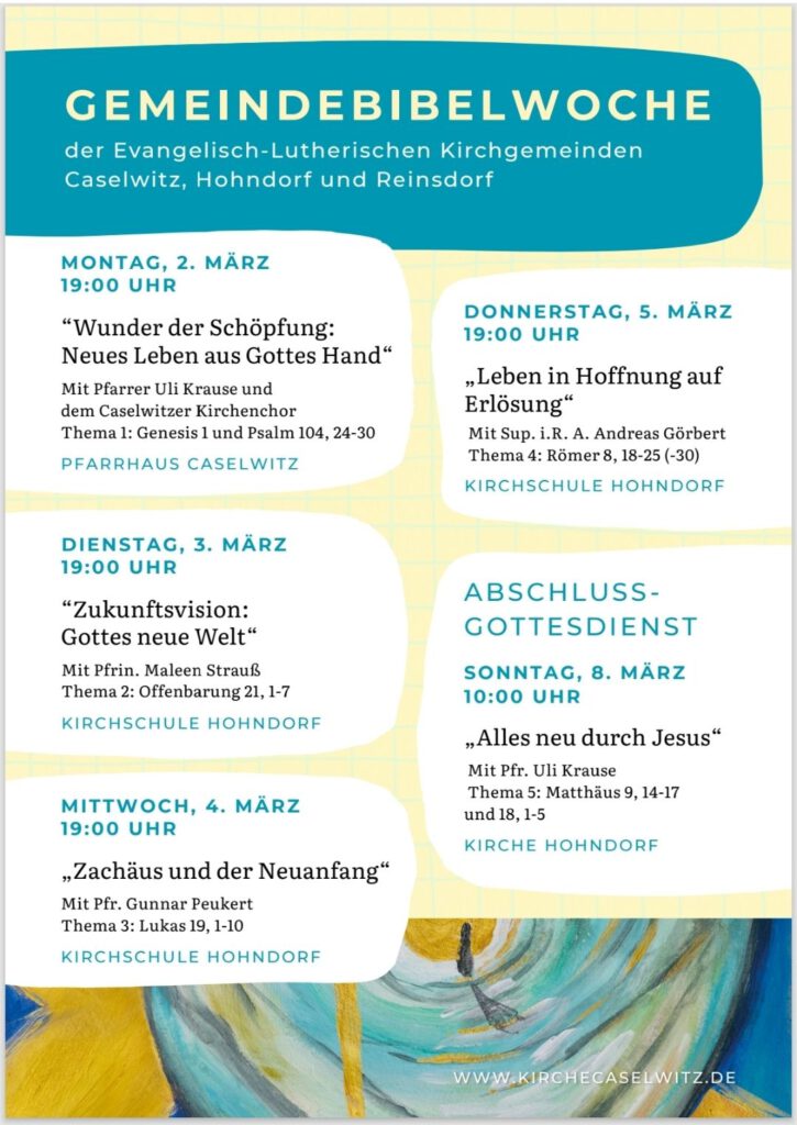 Vom 2. bis 8. März 2026 findet die Bibelwoche in Caselwitz und Hohndorf statt.